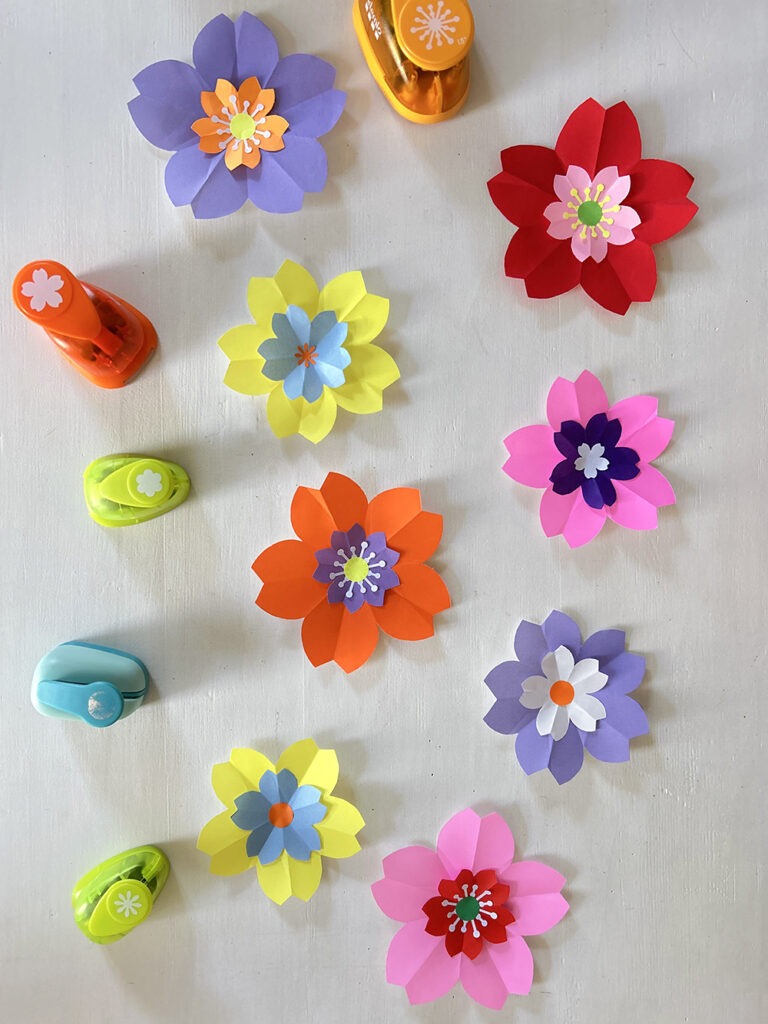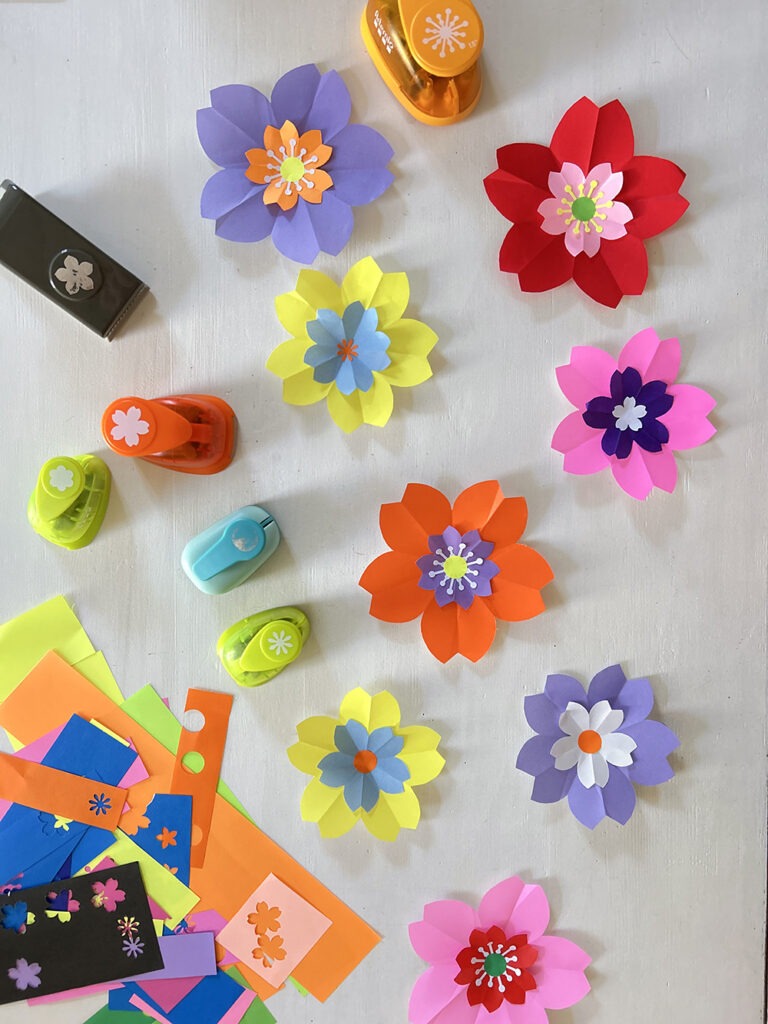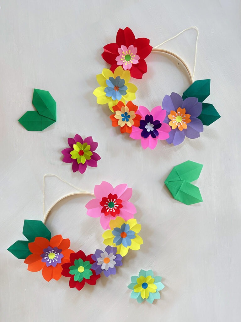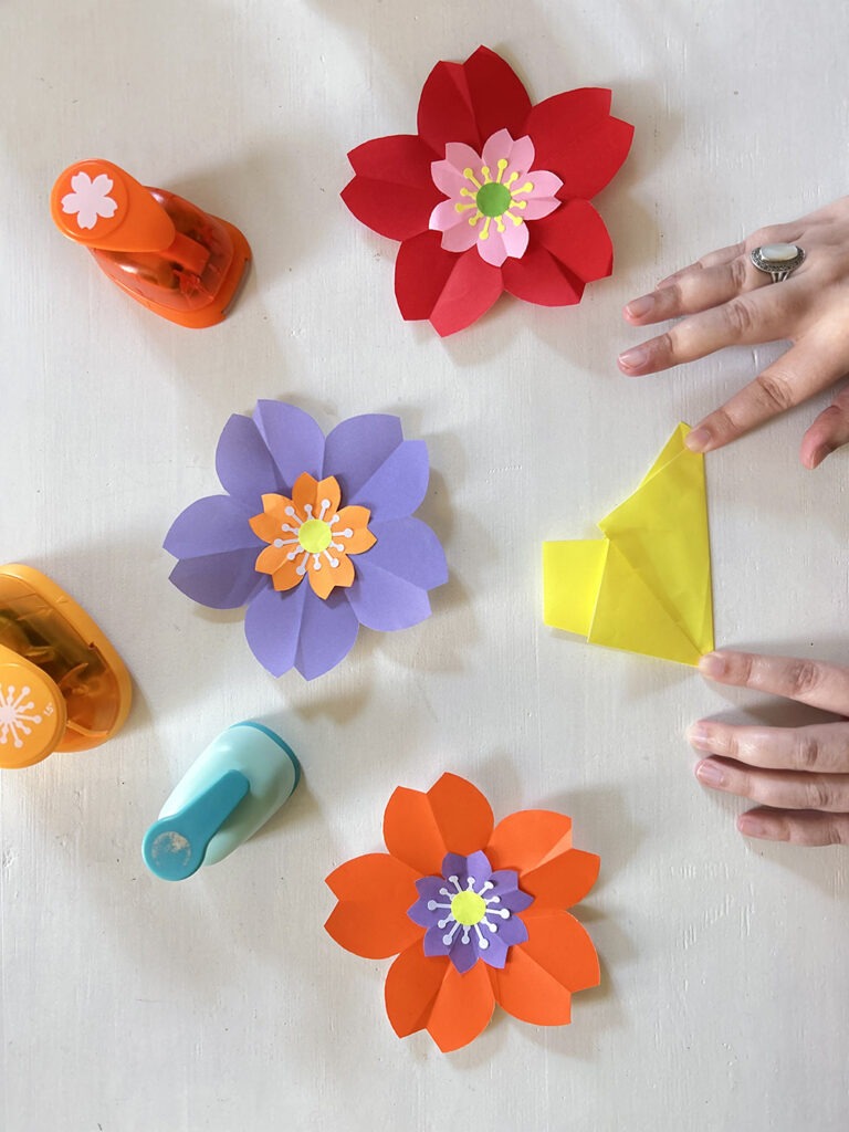 Première étape, choix des couleurs et confection de fleurs en origami de différentes tailles et ajout de pistils tout mignons réalisés à l’aide de perforatrices ! Puis montage sur cercle nu avec l’ajout d’un joli pliage feuille pour parfaire le tout !