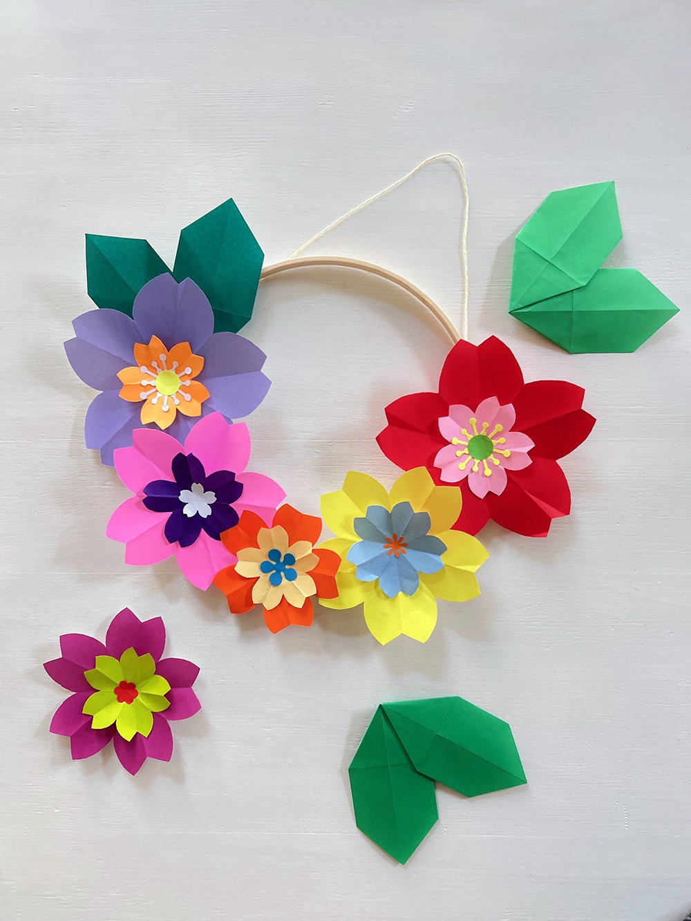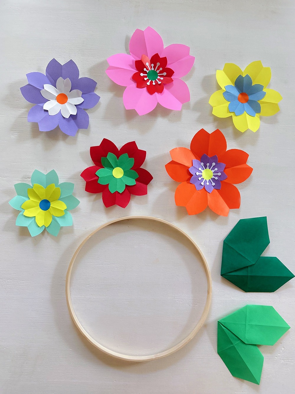 Première étape, choix des couleurs et confection de fleurs en origami de différentes tailles et ajout de pistils tout mignons réalisés à l’aide de perforatrices ! Puis montage sur cercle nu avec l’ajout d’un joli pliage feuille pour parfaire le tout !