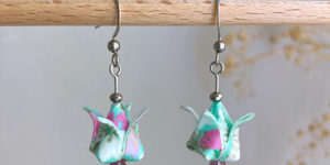 Nouveau modèle sur commande de boucles d’oreilles boutons de lotus en origami ! Ici papier japonais washi motif fleurs de cerisier japonais turquoise et améthyste. Vous pouvez personnaliser vos BO …