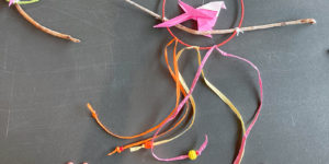 Journée ateliers des p’tites vacances de printemps à l’historial de la Vendée. Réalisation d’attrapes-rêves composés d’un oiseau en origami sur sa branche, de perles en bois et de rafia coloré …